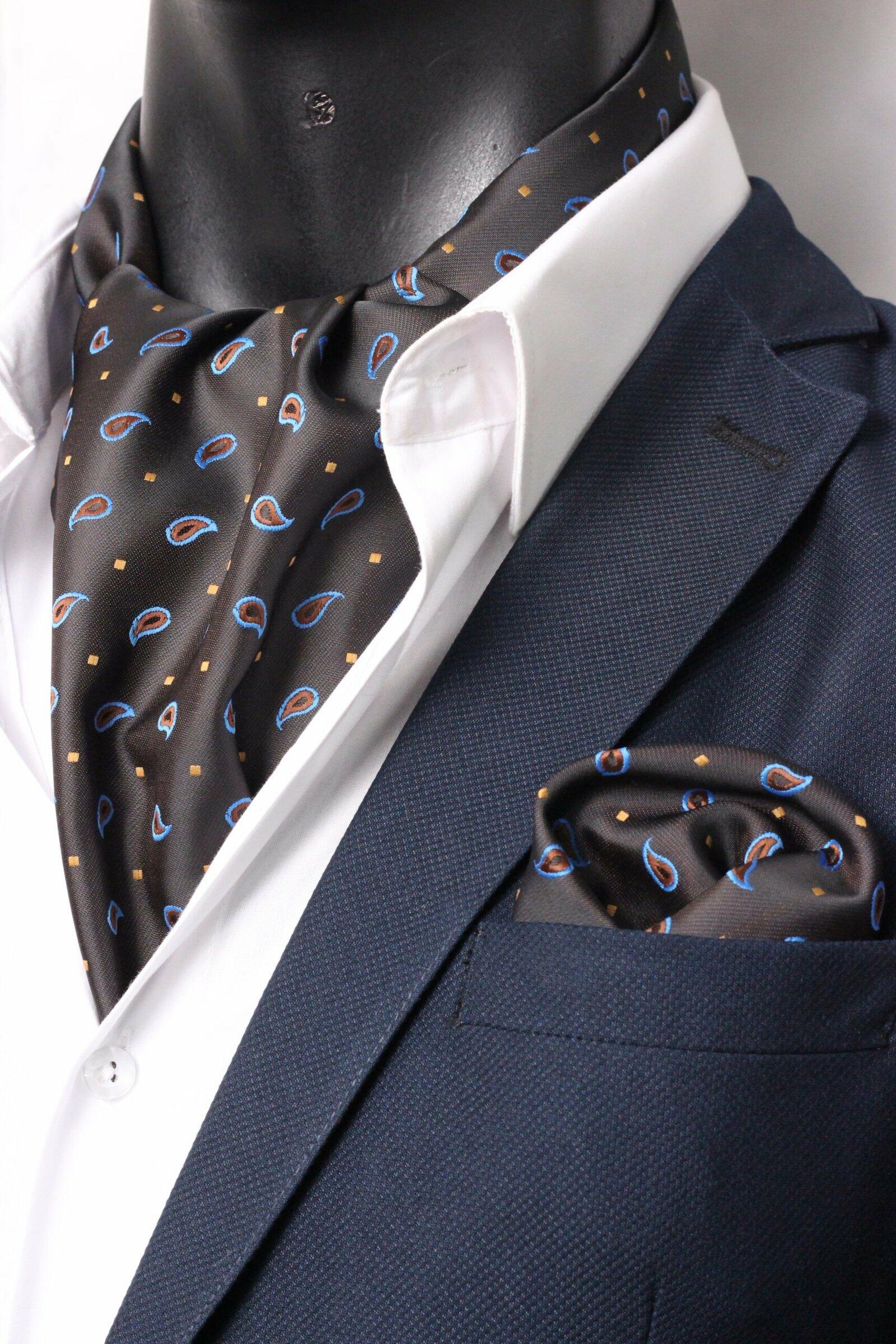HomeBrown Ascot Paisley with HankyBrown Ascot Paisley with HankyDescriptionCommand attention with this luxurious brown and blue paisley ascot scarf for men – a sophisticated neck accessory featuring a distinctive paisley pattern , perfect for weddings, formal events, and elegant style .