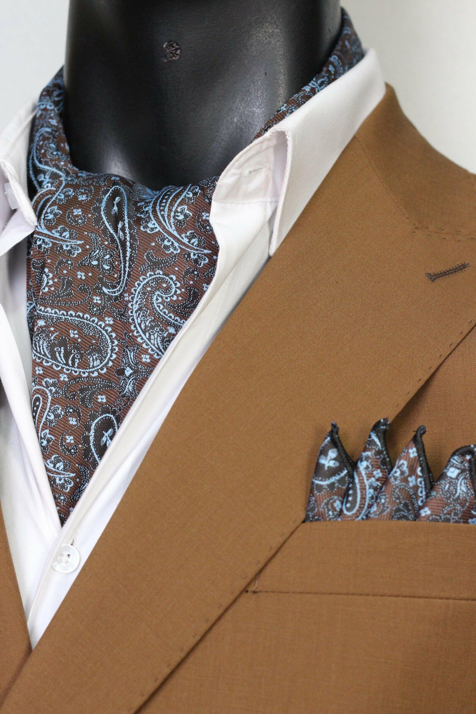 HomeBrown Ascot Paisley with HankyBrown Ascot Paisley with HankyDescriptionCommand attention with this luxurious brown and light blue paisley patterned ascot scarf for men. A sophisticated neck accessory featuring a distinctive paisley pattern, it's perfect for weddings, formal events, and elegant style .