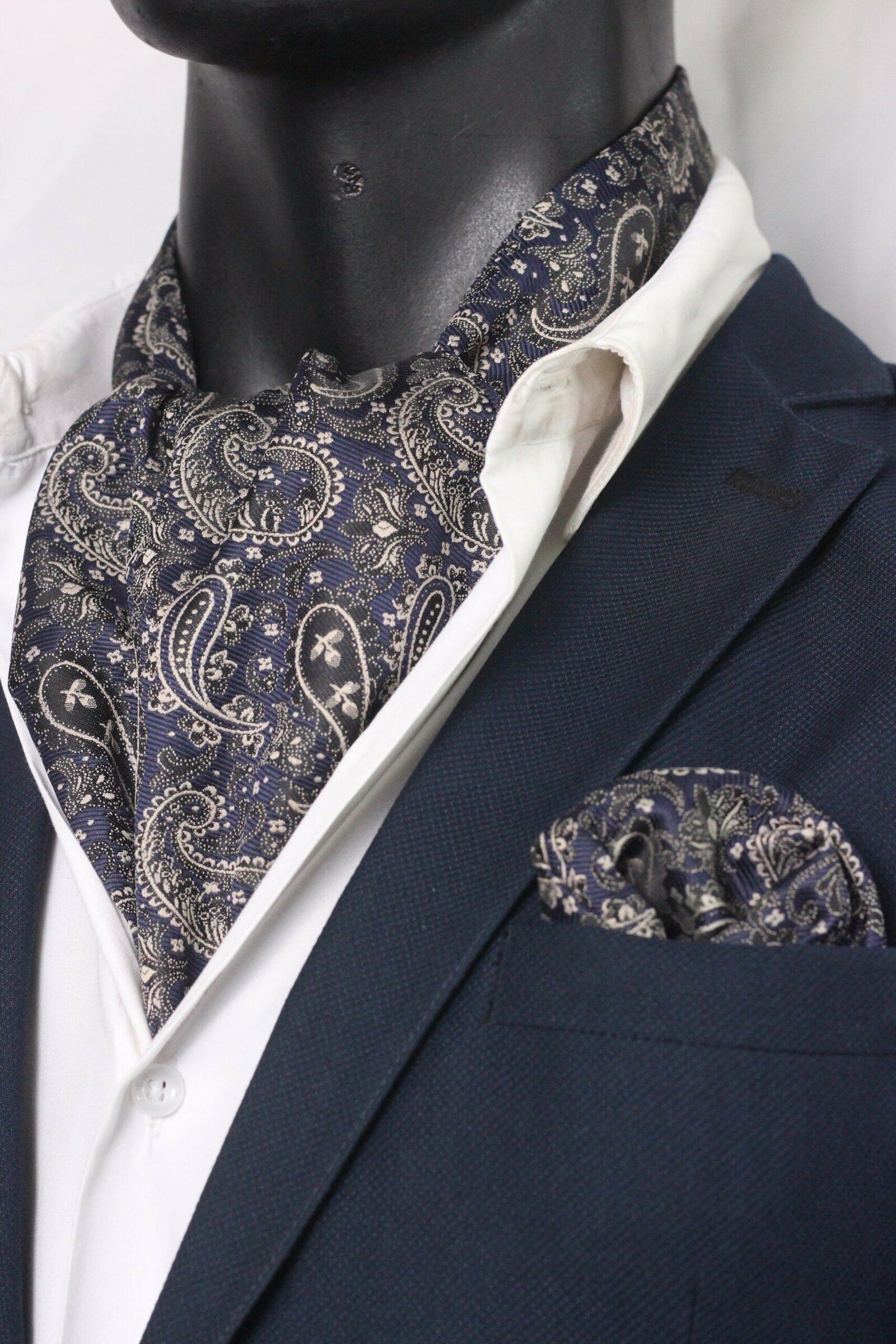 HomeDark Blue Ascot Paisley with HankyDark Blue Ascot Paisley with HankyDescriptionCommand attention with this luxurious navy blue and black paisley patterned ascot scarf for men. A sophisticated neck accessory featuring a distinctive paisley pattern, it's perfect for weddings, formal events, and elegant style .