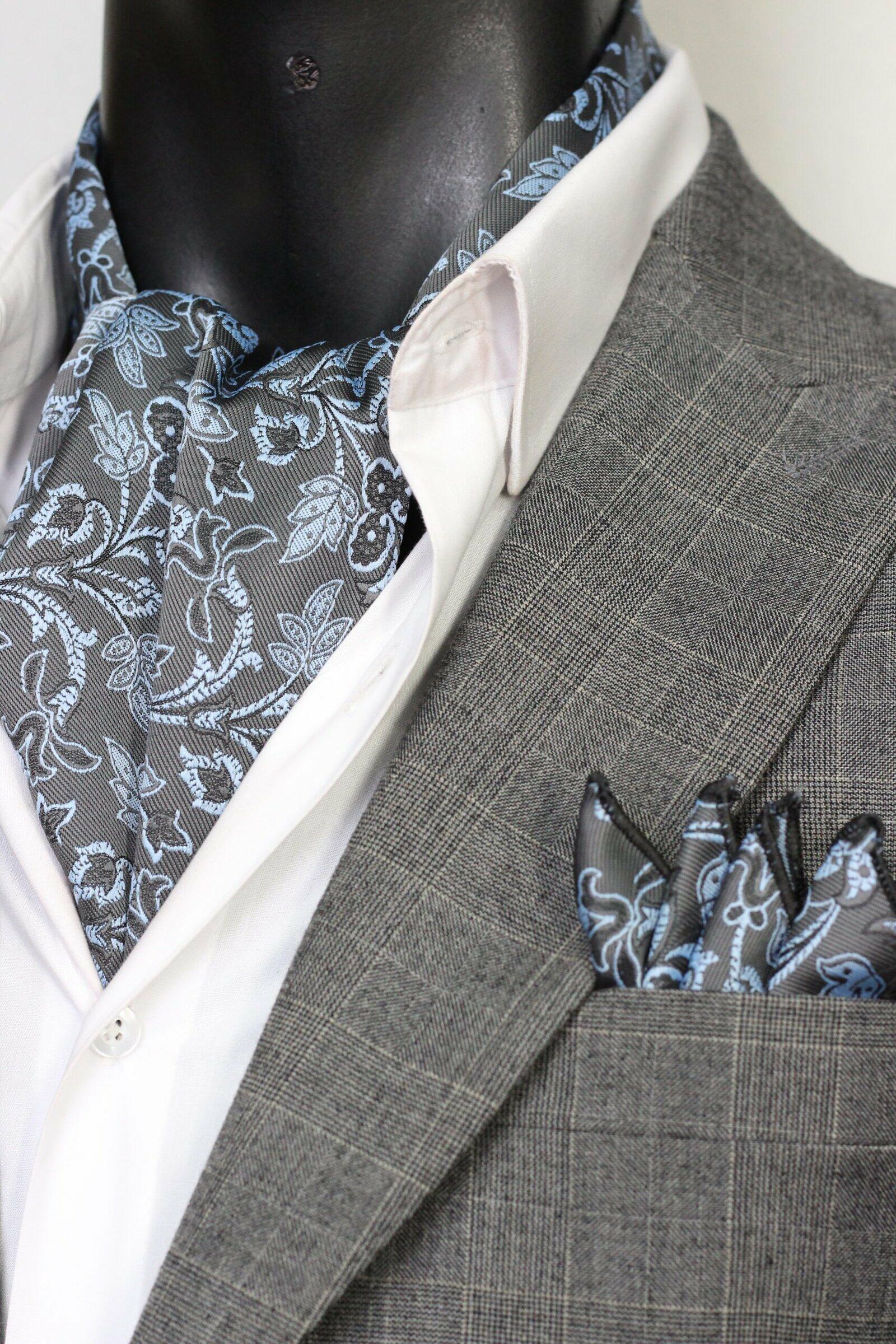 HomeGrey Ascot Floralf with HankyGrey Ascot Floralf with HankyDescriptionCommand attention with this luxurious dark grey and light blue floral patterned ascot scarf for men. A sophisticated neck accessory featuring a distinctive floral pattern, it's perfect for weddings, formal events, and elegant style .