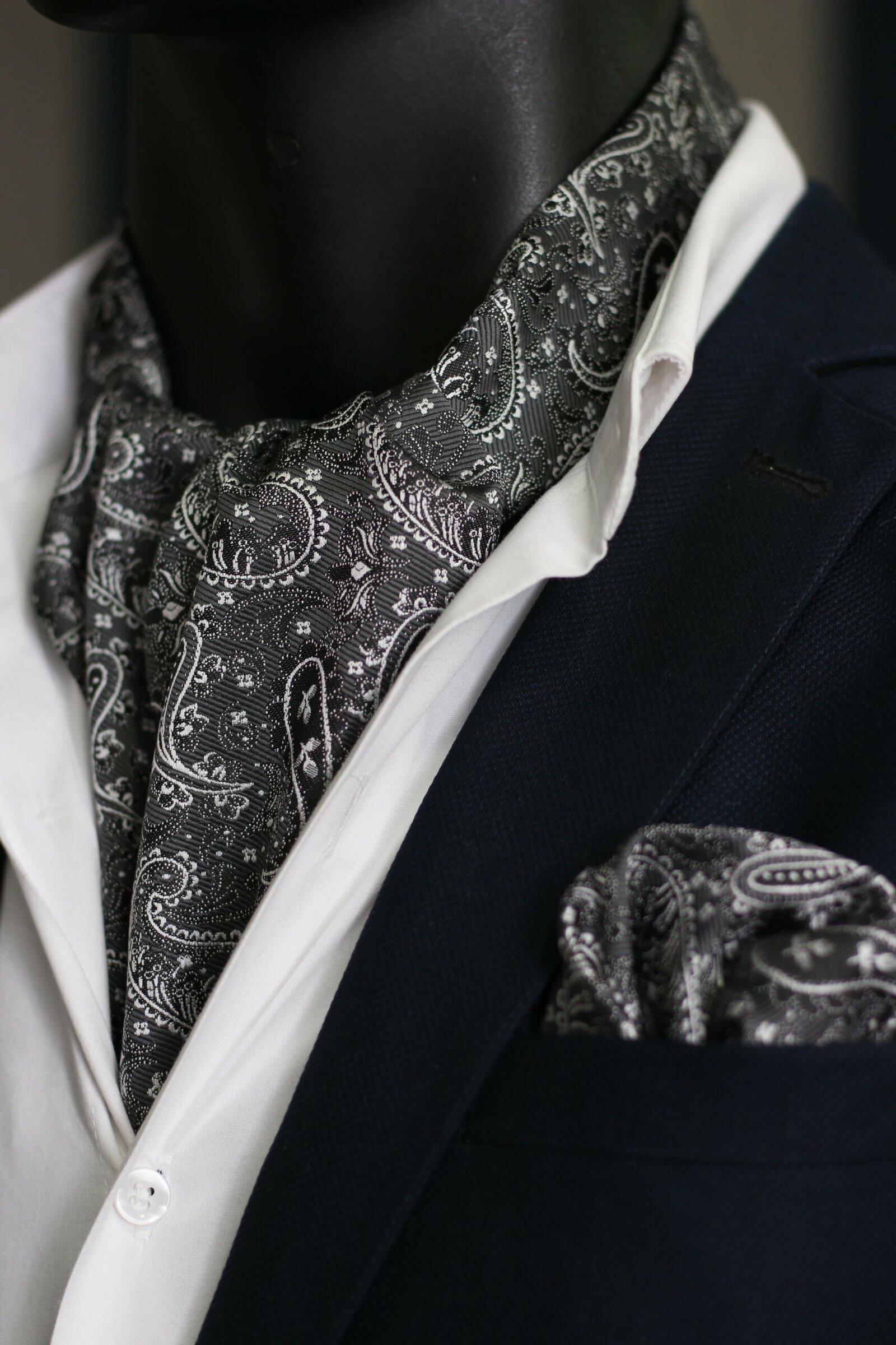 HomeGrey Ascot PaisleyGrey Ascot PaisleyDescriptionCommand attention with this luxurious charcoal grey and white paisley patterned ascot scarf for men. A sophisticated neck accessory featuring a distinctive paisley pattern, it's perfect for weddings, formal events, and elegant style .