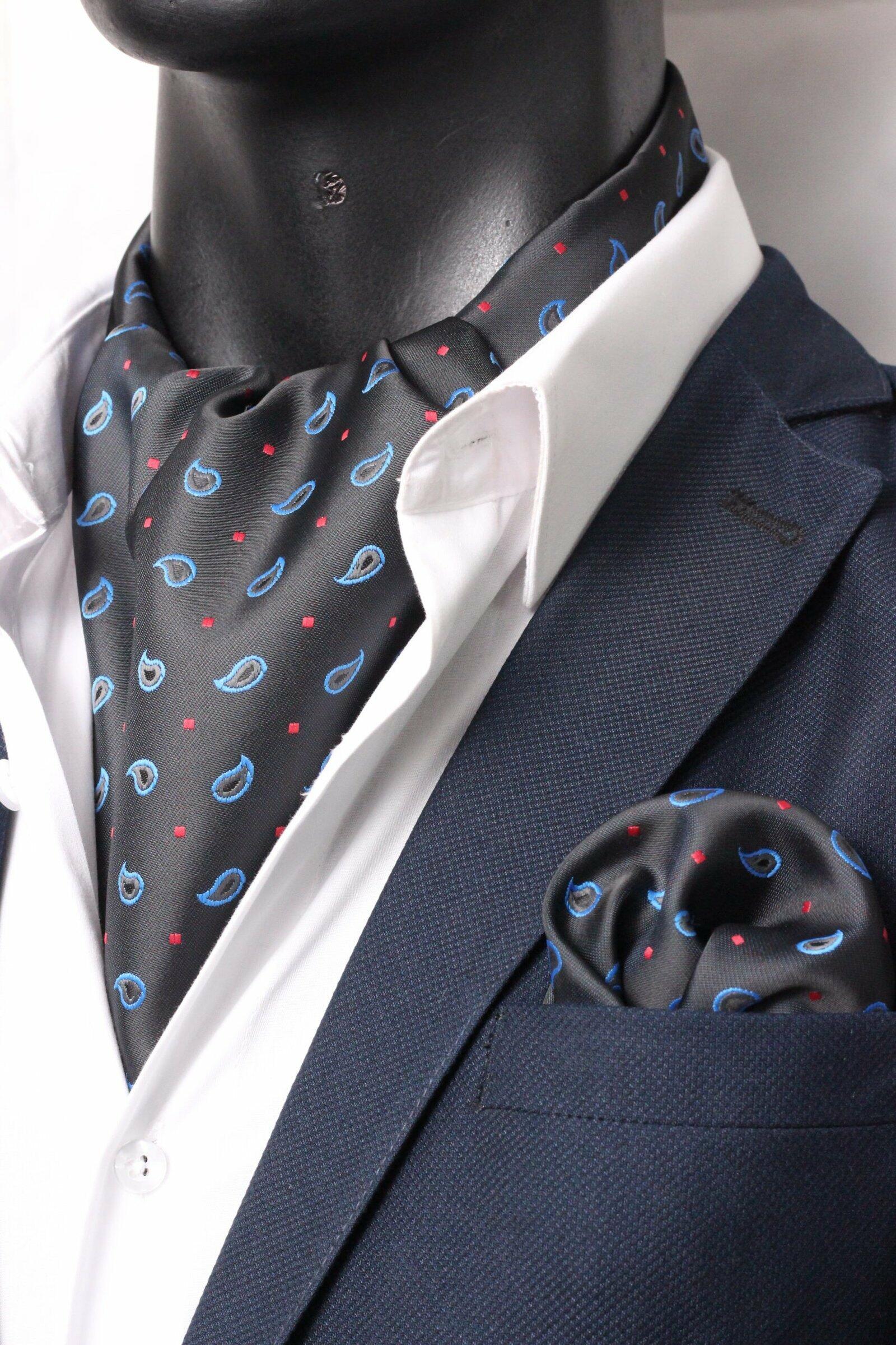 HomeGrey Ascot Paisley with HankyGrey Ascot Paisley with HankyDescriptionCommand attention with this luxurious navy blue and red paisley ascot scarf for men – a sophisticated neck accessory featuring a distinctive paisley pattern , perfect for weddings, formal events, and elegant style .