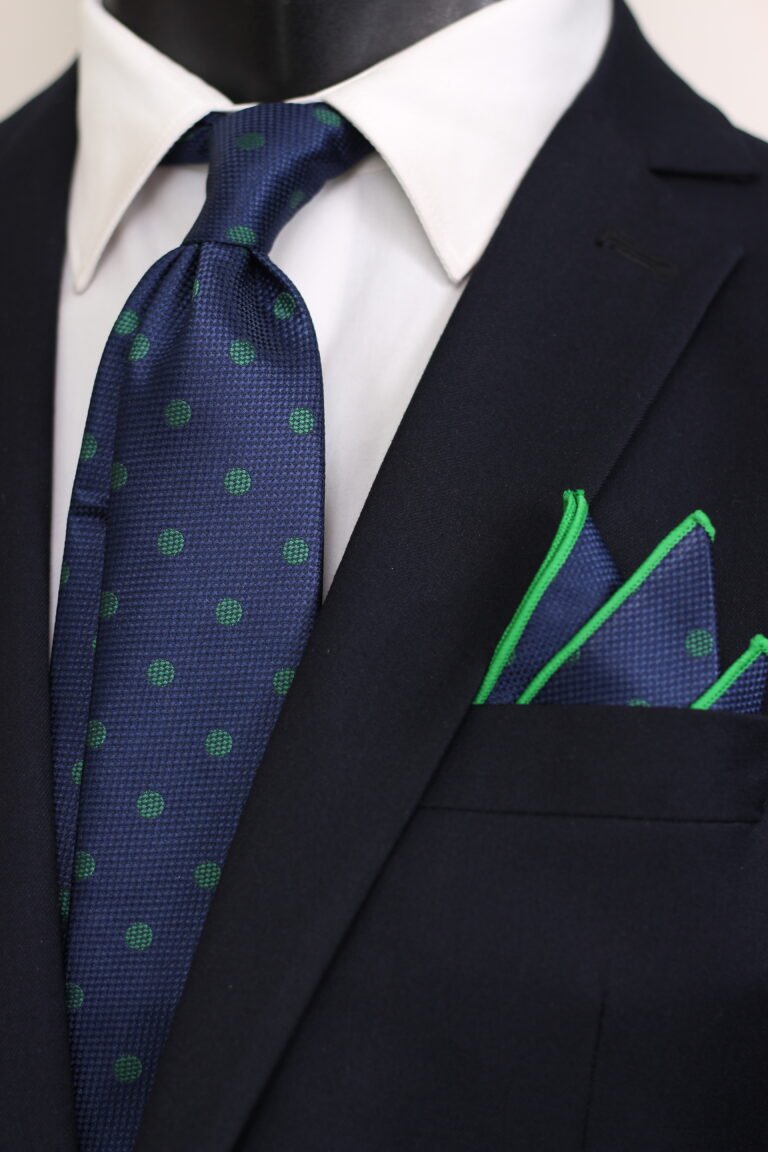 A sophisticated tie and accessory set featuring a classic navy blue background with a distinctive dot pattern. The pocket square is accented with a vibrant mint green border, creating a unique and modern look.