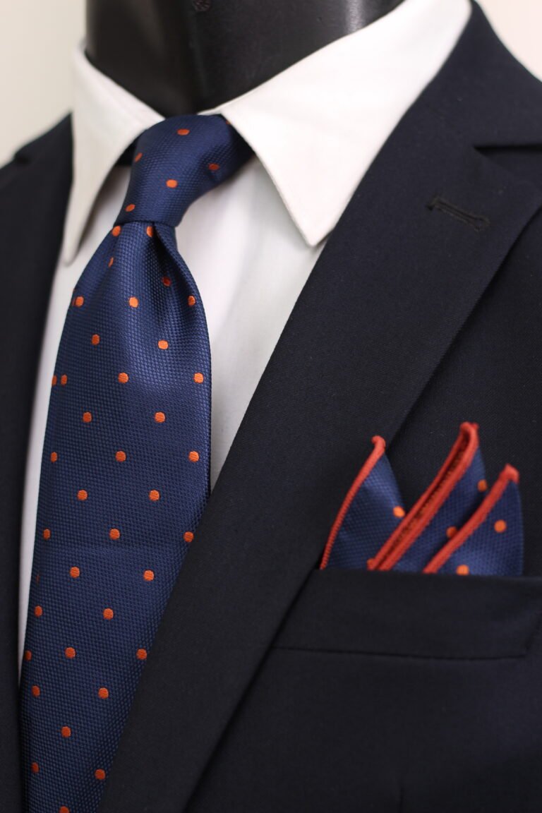 Show your elegance with this luxurious men's necktie and matching pocket square. A sophisticated tie and accessory set featuring a classic navy blue background with a subtle, intricate orange polka dot pattern. It's perfect for weddings, formal events, and smart style.Dotted Jaquard Neck Tie With Hanky