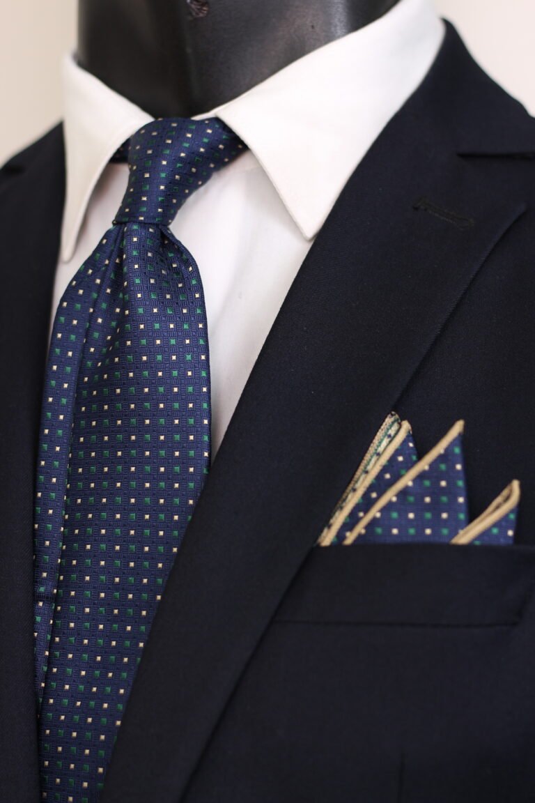 Show your elegance with this luxurious men's necktie and matching pocket square. A sophisticated tie and accessory set featuring a classic navy blue background with a subtle, intricate green polka dot pattern. It's perfect for weddings, formal events, and smart style.