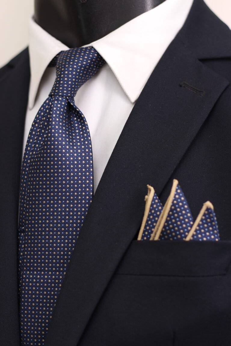 Show your elegance with this luxurious men's necktie and matching pocket square. A sophisticated tie and accessory set featuring a classic navy blue background with a subtle, intricate tan polka dot pattern. It's perfect for weddings, formal events, and smart style.Dotted Jaquard Neck Tie With Hanky