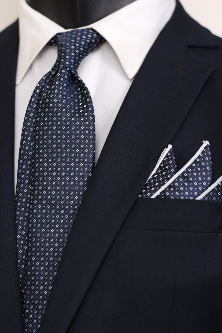 A sophisticated tie and accessory set featuring a classic navy blue background with a subtle dot pattern. The pocket square is accented with a vibrant light blue border, creating a unique and modern look.