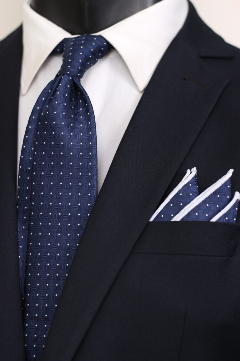 Show your elegance with this luxurious men's necktie and matching pocket square. A sophisticated tie and accessory set featuring a classic navy blue background with a subtle, intricate light blue large polka dot pattern. It's perfect for weddings, formal events, and smart style.Dotted Jaquard Neck Tie With Hanky
