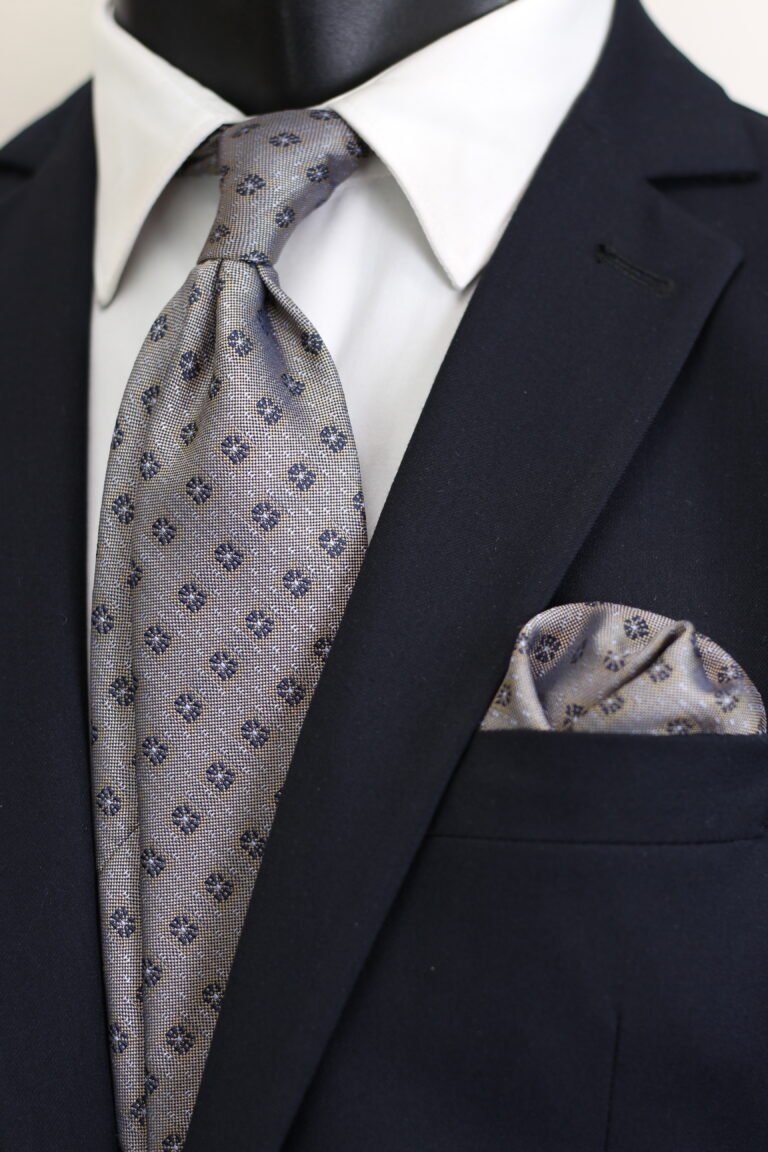 A sophisticated tie and accessory set featuring a luminous silver-taupe background with a striking, intricate micro-geometric floral dot pattern in dark blue and gold.