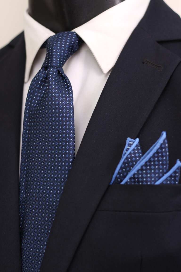 A sophisticated tie and accessory set featuring a classic navy blue background with a subtle dot pattern. The pocket square is accented with a vibrant light blue border, creating a unique and modern look.