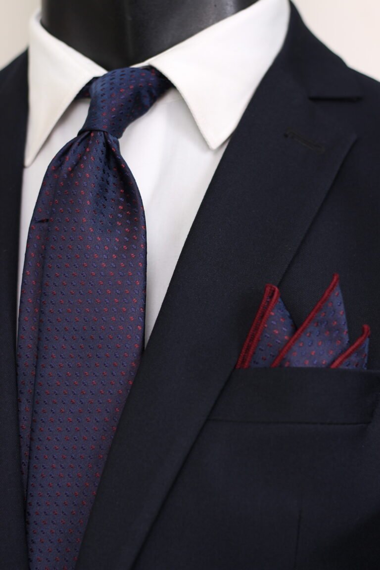 A sophisticated tie and accessory set featuring a classic navy blue background with a subtle pattern of fine red dots. The pocket square is accented with a deep red border, creating a rich, cohesive look.