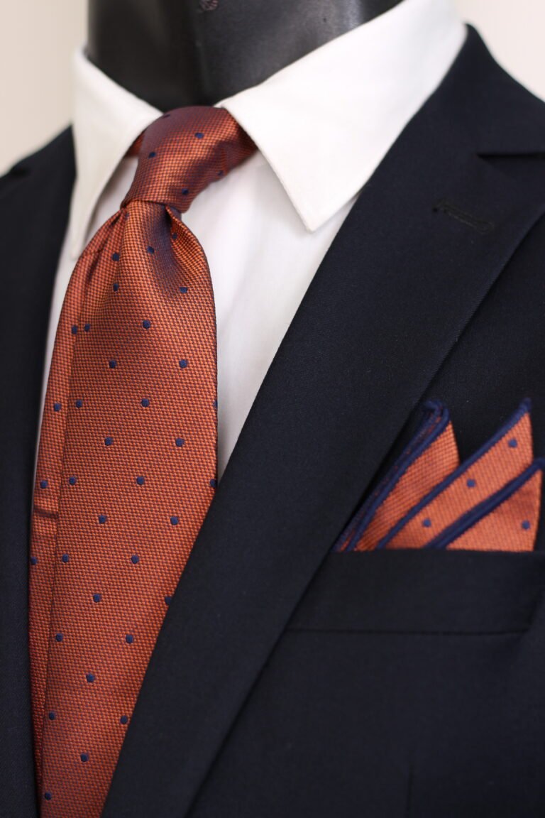 A sophisticated tie and accessory set featuring a warm orange/rust background with a subtle pattern of fine blue dots. The pocket square is accented with a navy blue border.