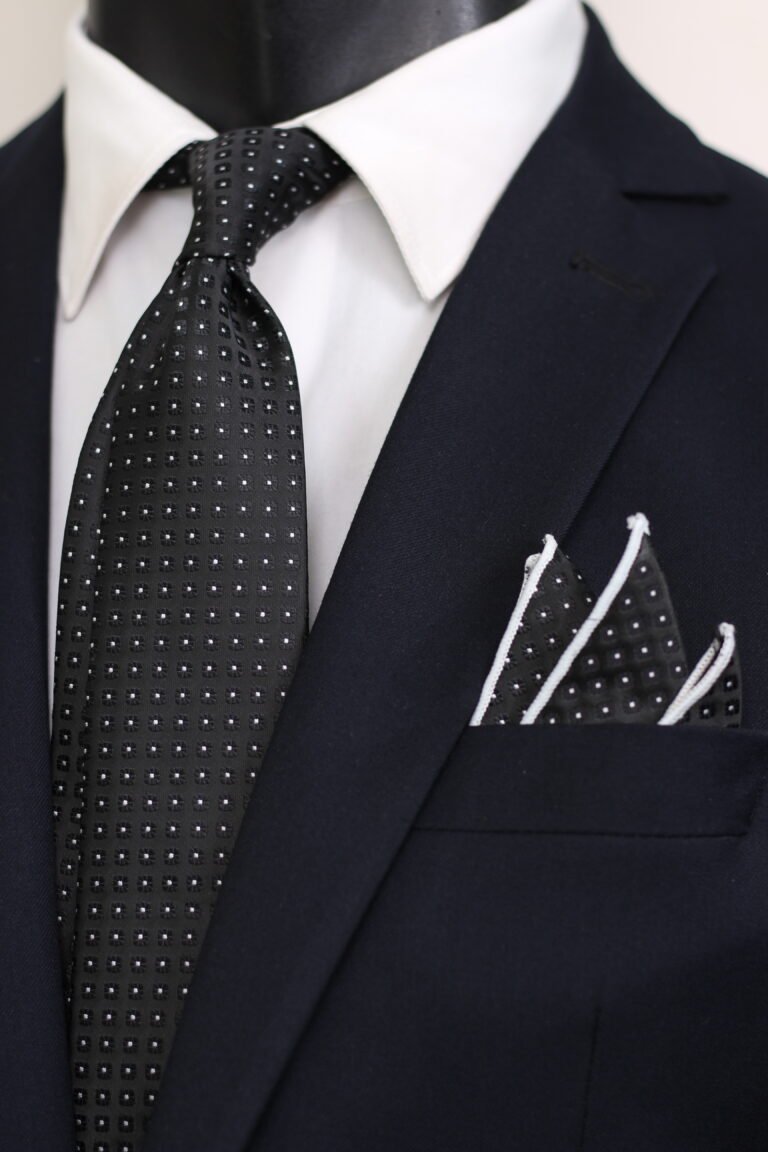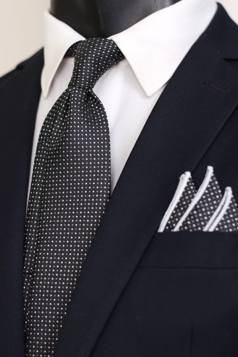 A sophisticated tie and accessory set featuring a classic black background with a subtle, intricate pattern of fine white dots. The pocket square is accented with a thick white border.